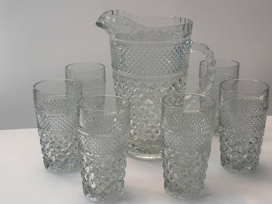 Vintage Anchor Hocking Wexford Diamond Cut Clear Glass Pitcher and 6 Tumblers Set