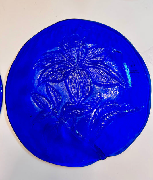 Vintage Art Glass Plates/Bowls (Set of 2) - Embossed Iris & Lily Flower Design - Decorative Serving Dishes