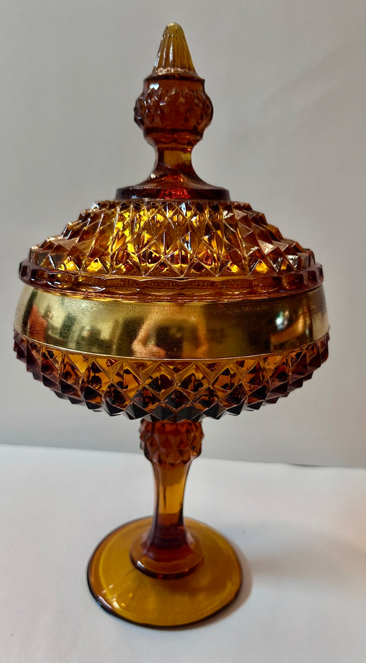 Vintage Amber Diamond Point Glass Candy Dish with Gold Trim