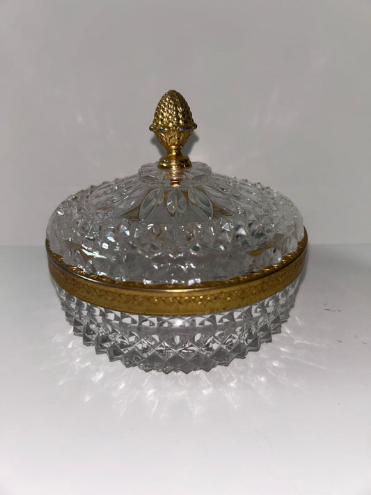 Vintage Baccarat Style Diamond Cut Crystal (4.5”) Candy Dish/ Powder Box with Gilt Bronze Rim