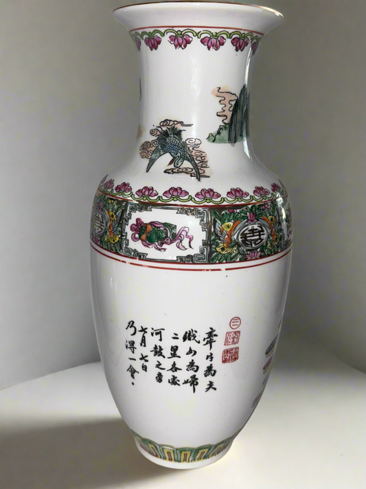 Mid Century Hand-Painted White Chinese/Macau Signed Porcelain Famille Rose Style Vase - Figurative