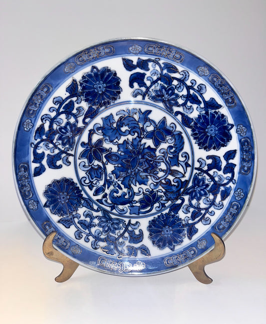Unique Chinese Blue & White Golden Details Hand Painted Decorative Plate