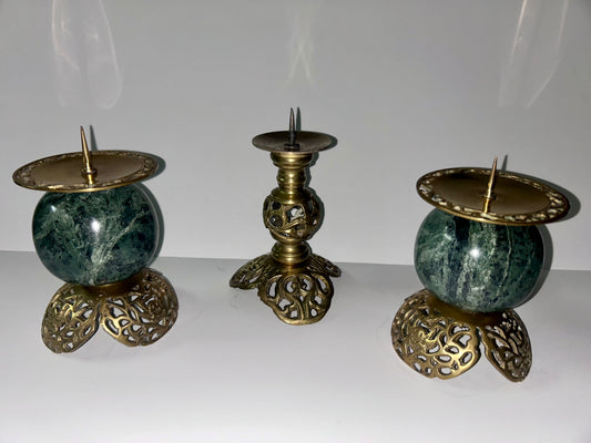 Vintage Dark Green Marble and Bronze Filigree Candle Holders(Set of 2)