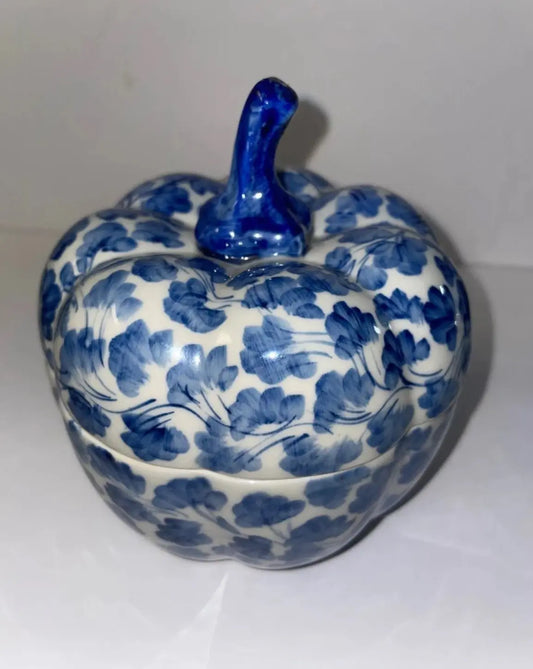 Vintage Blue and White Pumpkin Porcelain Shaped Trinket Box and Candle Holders