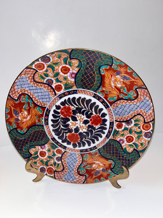 Vintage Japanese SAJI Fine Porcelain Hand-Painted Dragon Peony Floral Gold Trim Plate