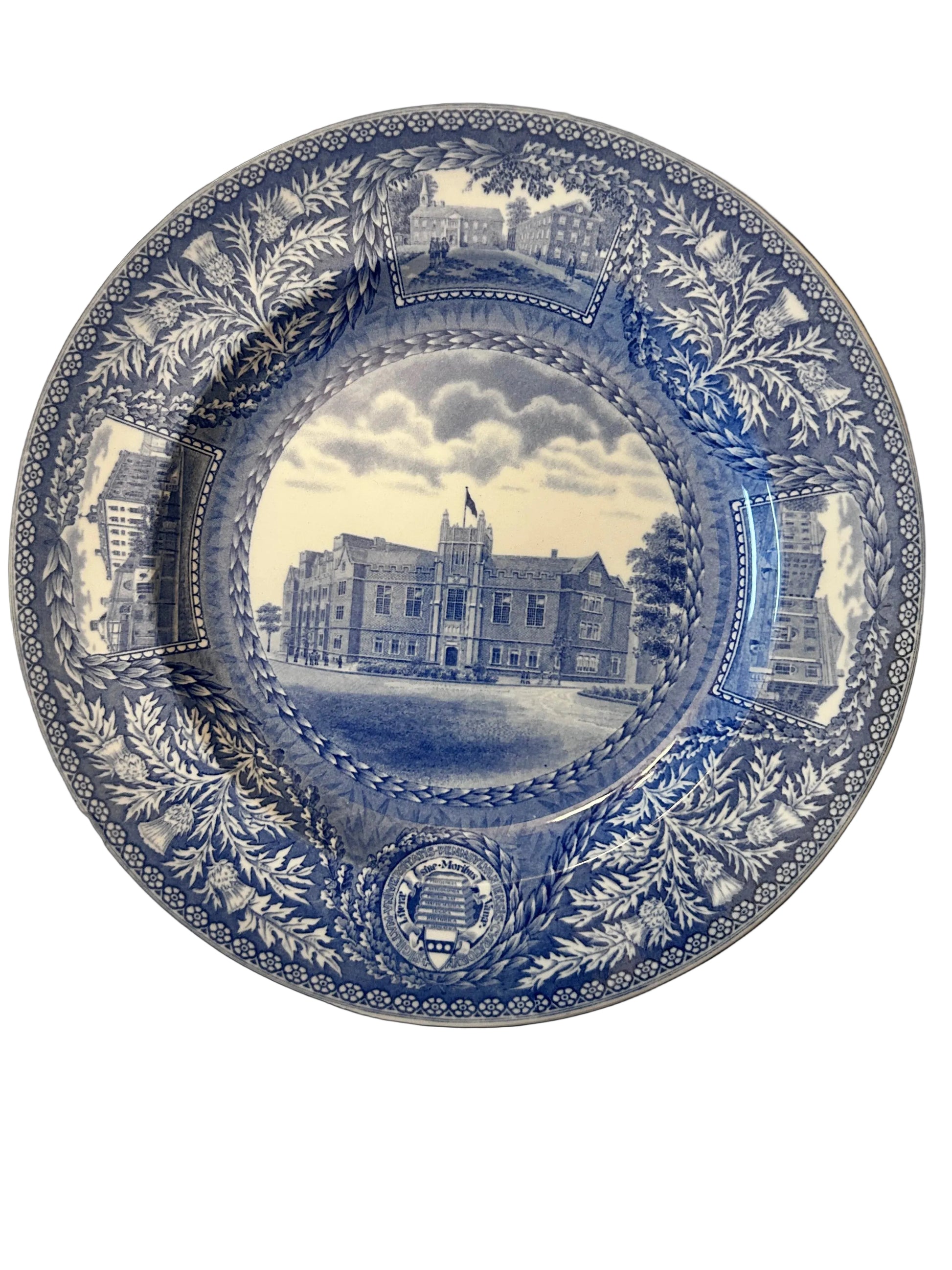 - Design: Each plate features a central medallion depicting a landmark UPenn building (e.g., Provost Tower, College Hall, etc.) surrounded by an intricate floral and thistle border that incorporates the university seal.