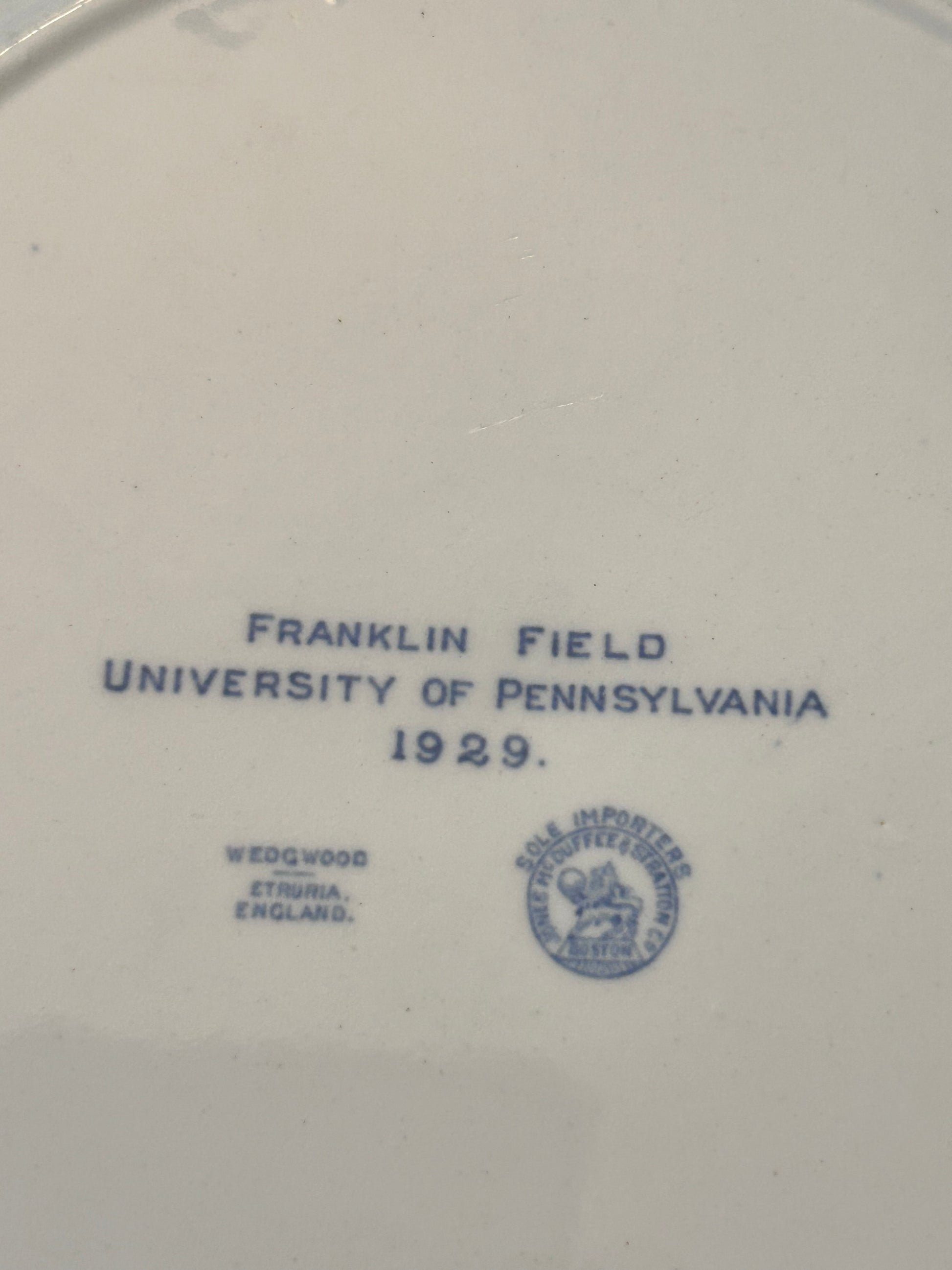 - Markings: The back includes the specific building name, the "University of Pennsylvania 1929" stamp, the Wedgwood Etruria hallmark, and the importer's seal. It also features an impressed "WEDGWOOD" mark and date codes.