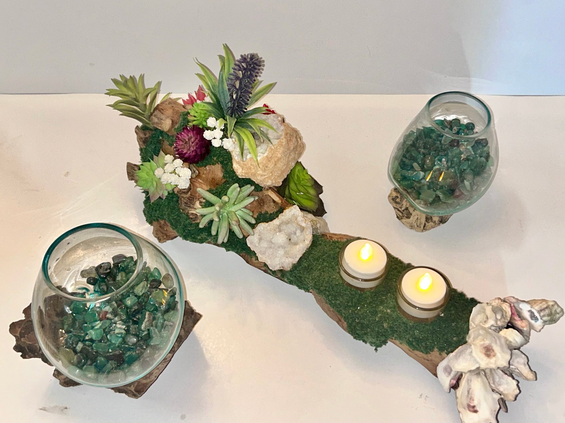 This unique, handcrafted 3-piece decor set combines natural elements with mystic and rustic charm, perfect for creating a calming, earthy display.
