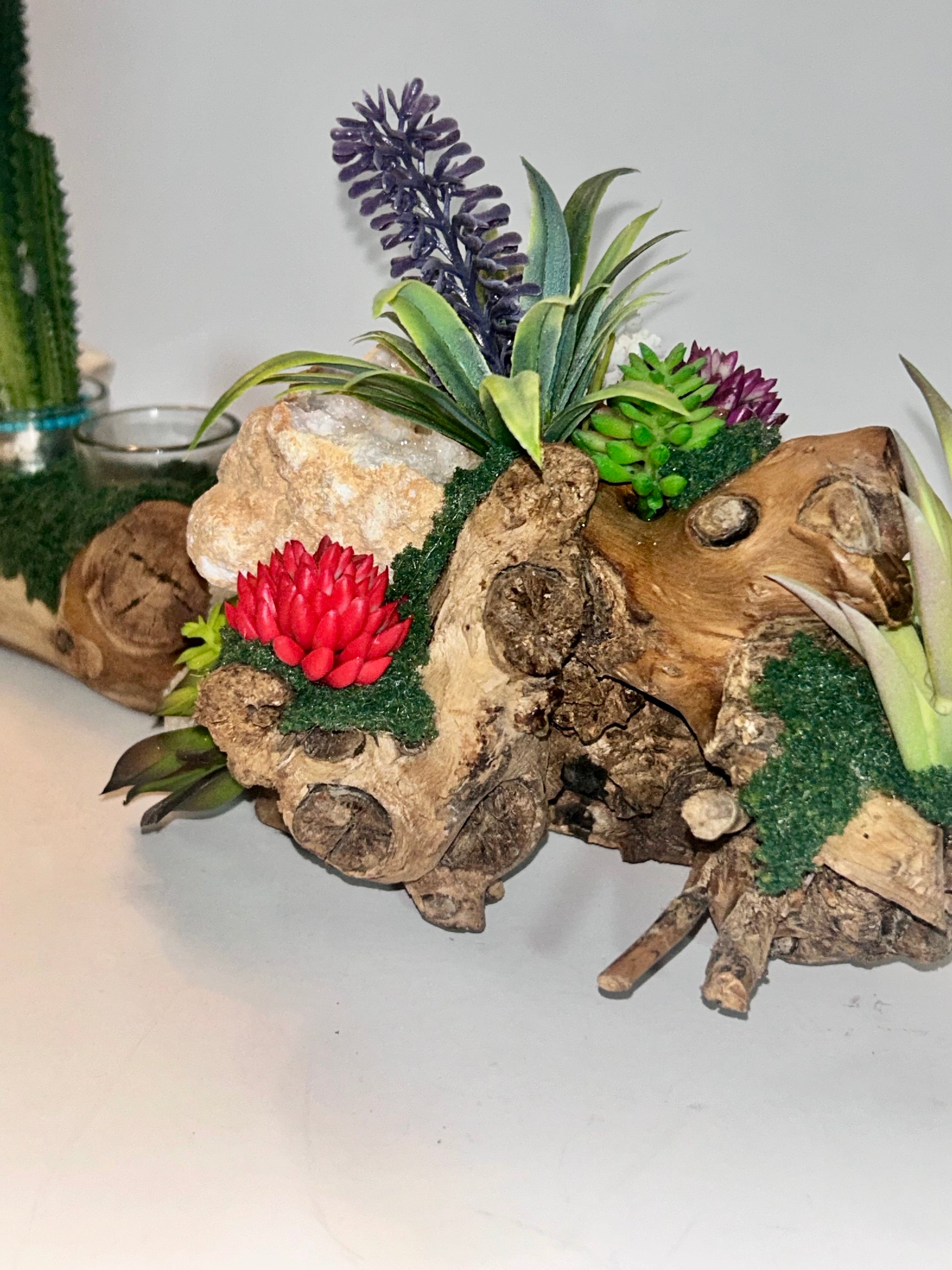 - Arrangement: Features a vibrant display of realistic faux succulents, flowering plants, and preserved moss.