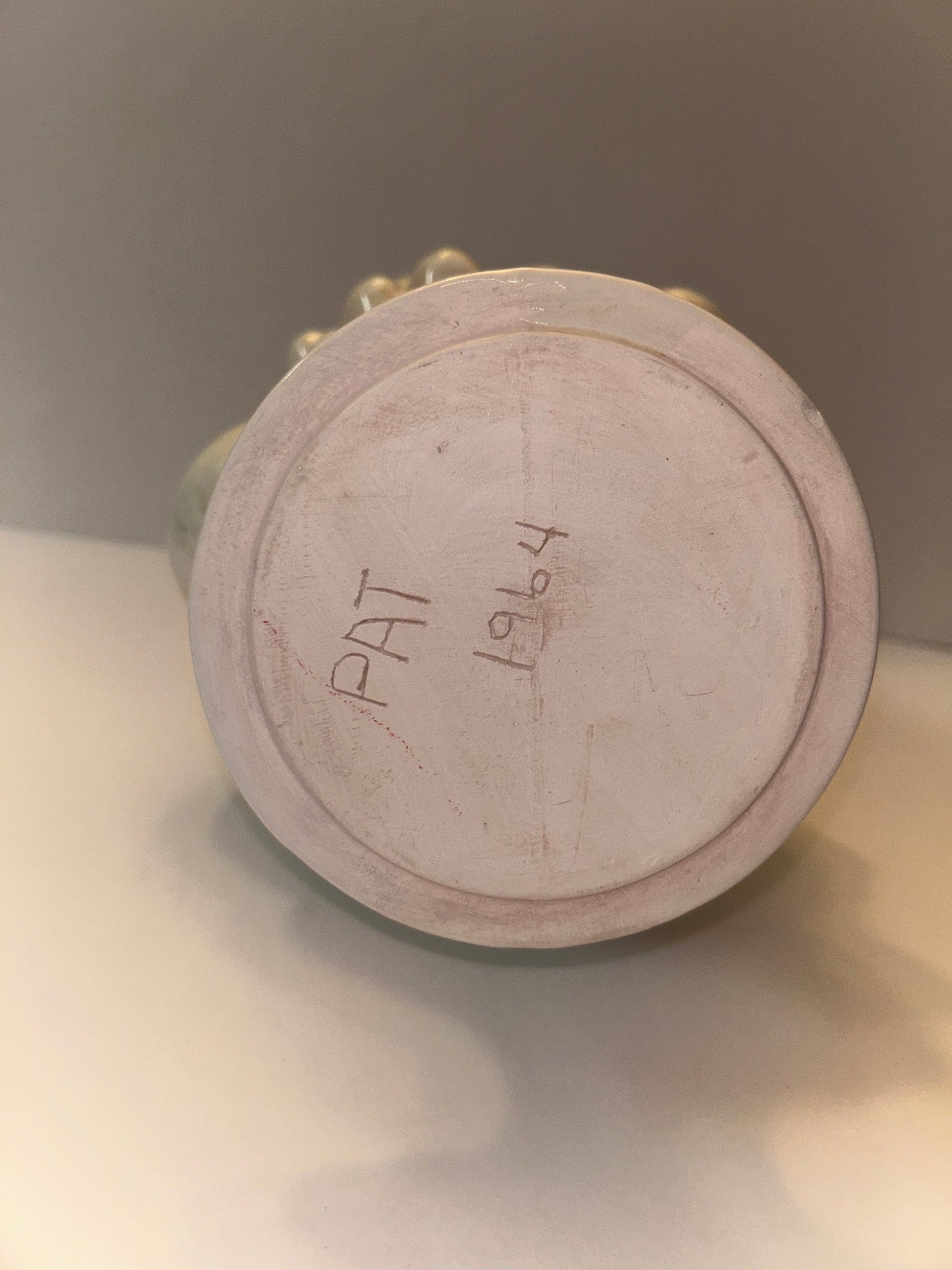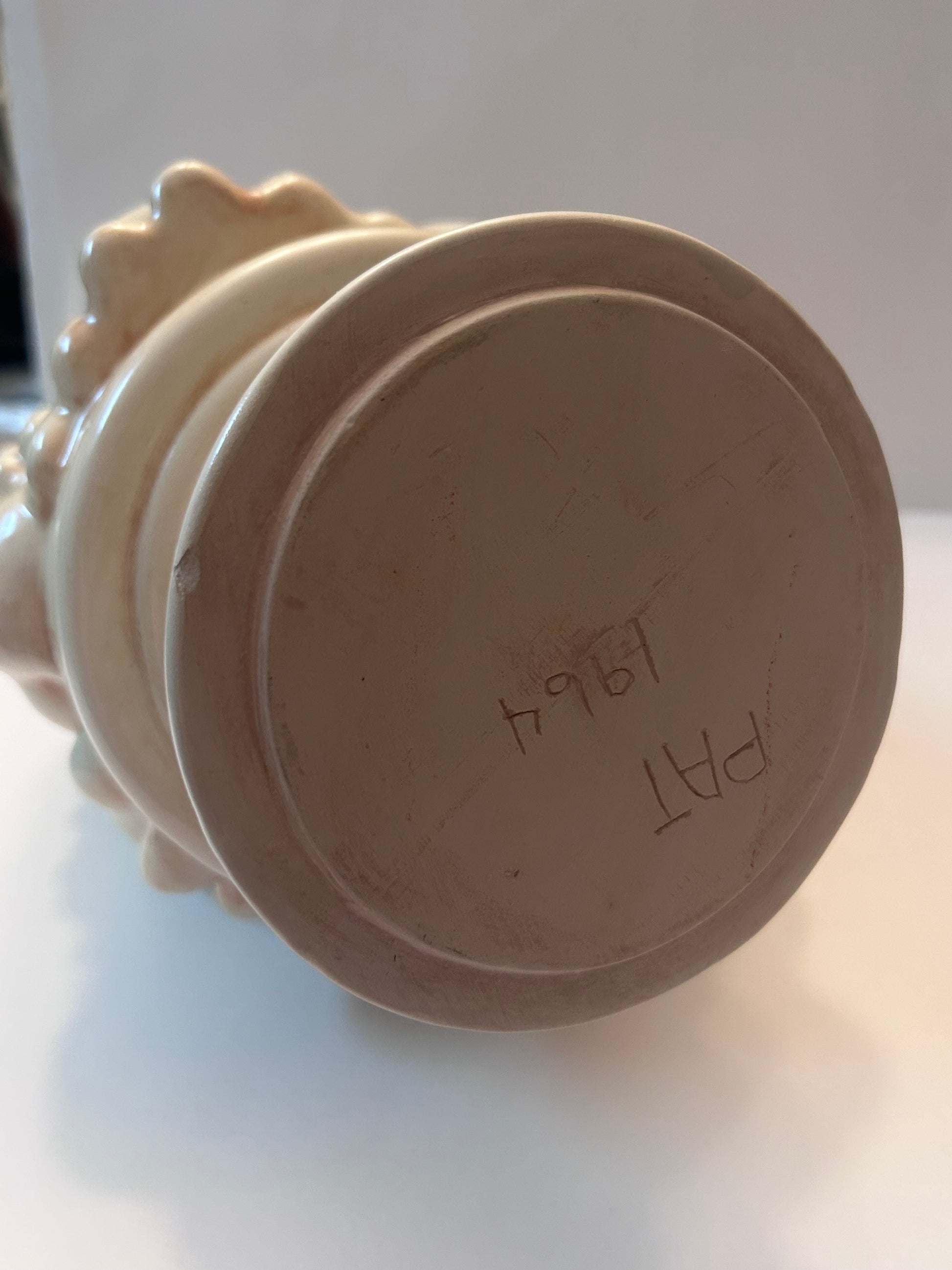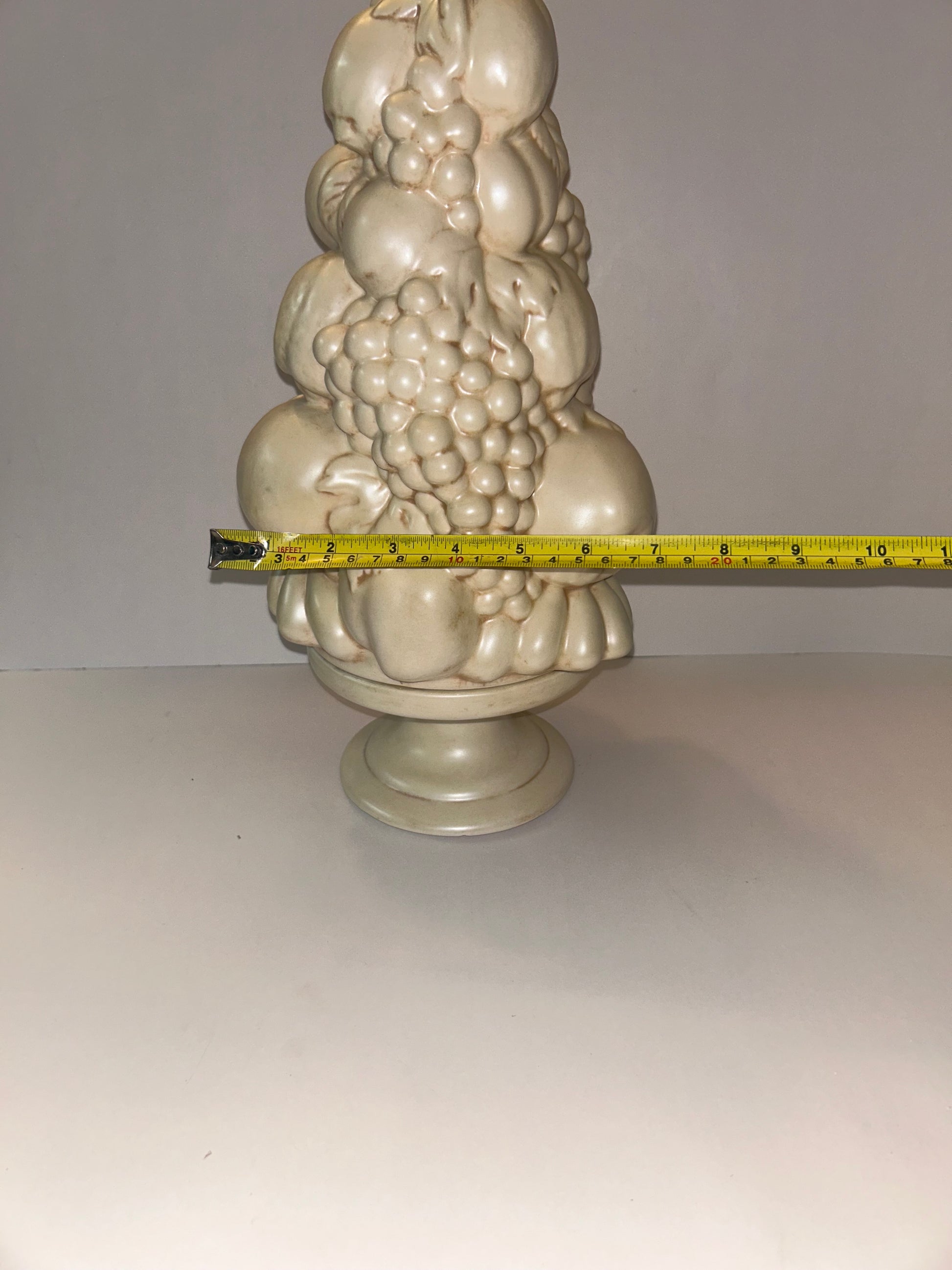 This is a beautiful vintage fruit topiary centerpiece from 1964, signed "PAT" on the base. It features a detailed arrangement of various fruits, including grapes, pears, and apples, stacked on a pedestal base. The piece has a lovely lightly glazed finish and a soft, off-white color that complements a variety of decor styles, from classic and traditional to modern farmhouse. Its size makes it an impressive centerpiece for a dining room table or a statement piece on a console or credenza.