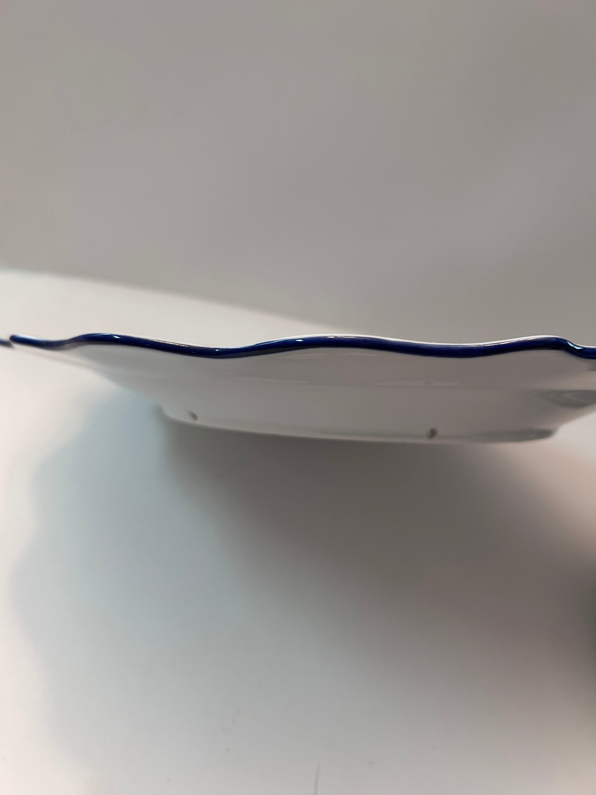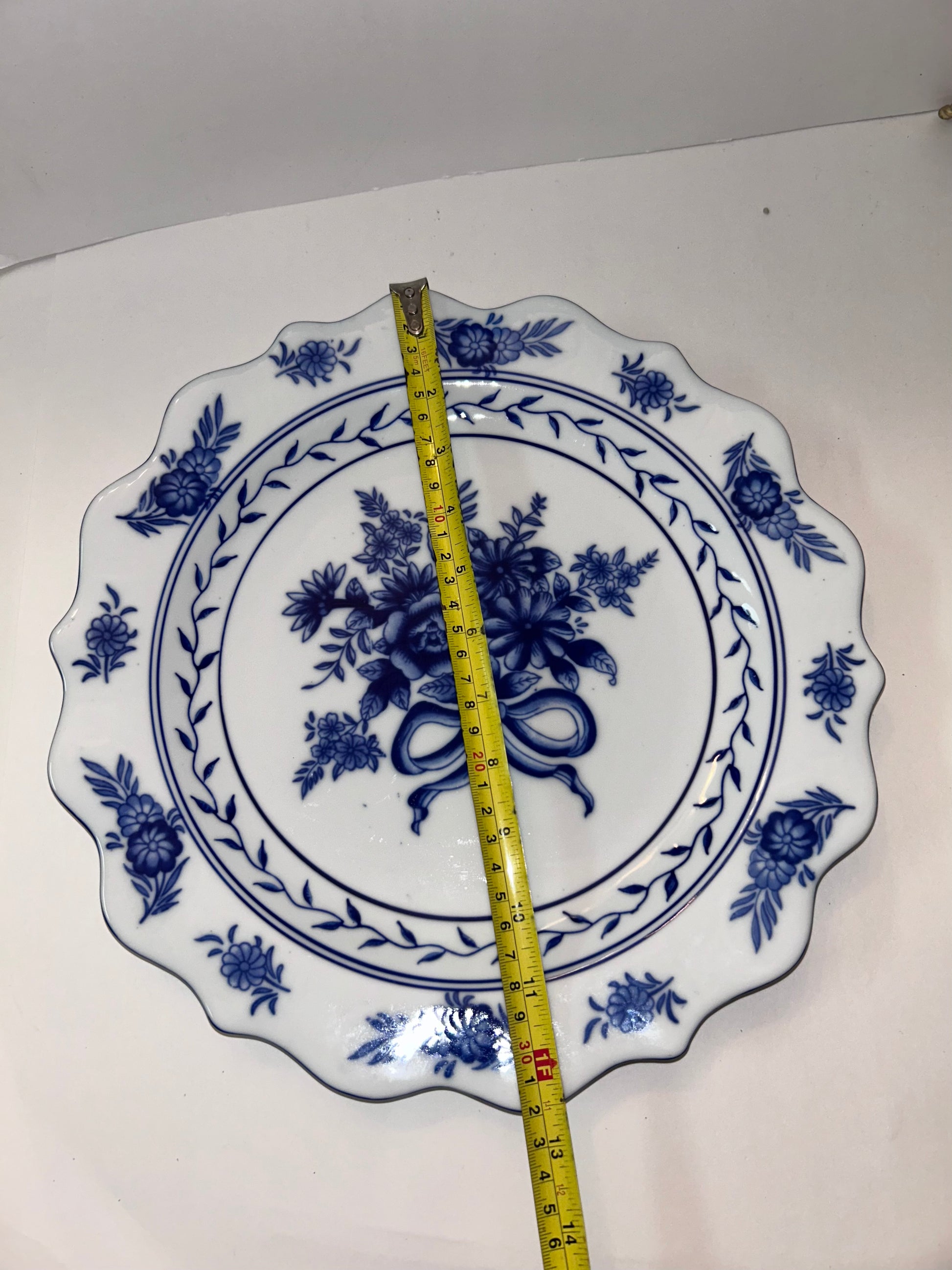 A beautiful and vintage ceramic serving platter from Cracker Barrel's discontinued "Blue Garden" collection. The platter features an elegant blue and white design, centered with a stunning floral bouquet tied with a decorative ribbon and bow. A delicate vine and leaf pattern circles the interior, and the entire piece is finished with a charming scalloped rim.