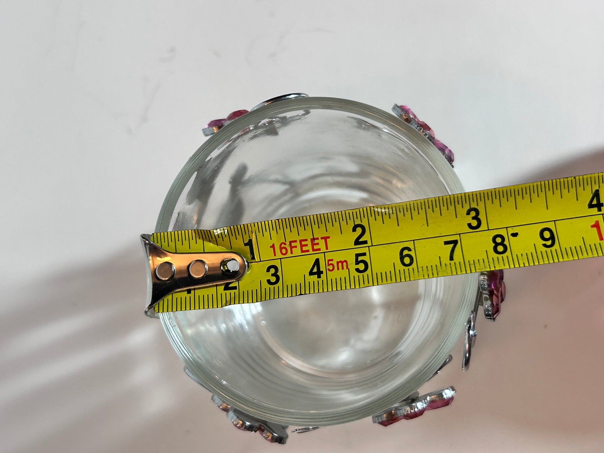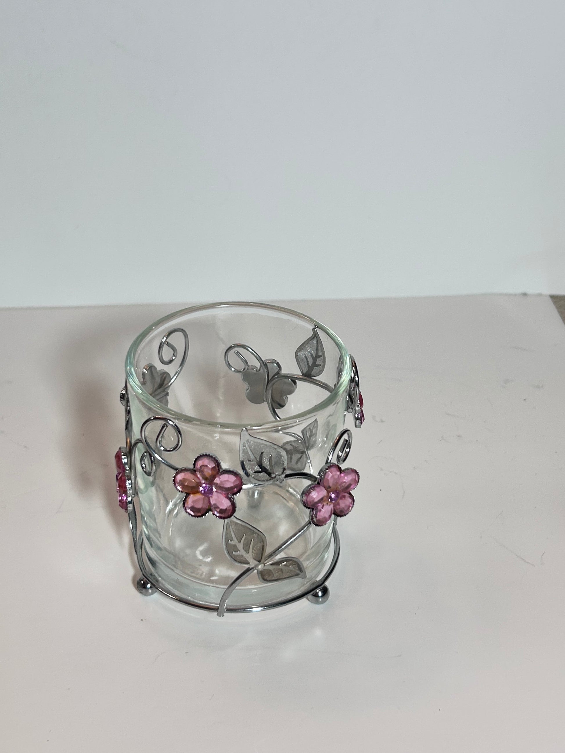 - Jeweled Floral Votive: A clear glass candle holder encased in a silver-toned metal filigree frame. The frame is decorated with delicate metal leaves and pink gemstone flowers.